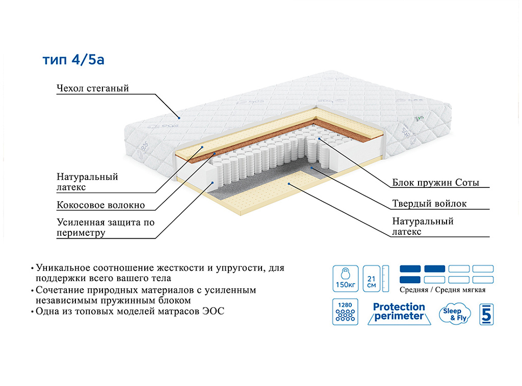 | Материал | Латекс, Блок независимых пружин, Чехол, Войлок, Кокосовое волокно |