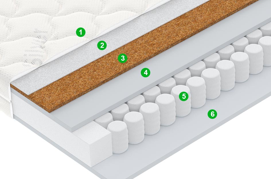 Кокосовая койра | Натуральный материал из кокосовых волокон, спресованных в однородные плиты. Слой используется для придания матрасу дополнительной жесткости. |