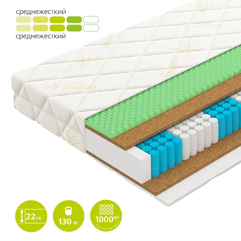 Trust -cреднежесткий матрас с разными поверхностями сторон: двойной слой кокосовой койры надежно поддерживает позвоночник, а технологичная пена с микромассажным эффектом бережно расслабляет и снимает нагрузку с мышц и суставов. Ортопедический эффект усиливается благодаря 7 зонам поддержки в независимом пружинном блоке. Съемный чехол из мягкой трикотажной ткани Bambootex комфортен и прост в уходе.