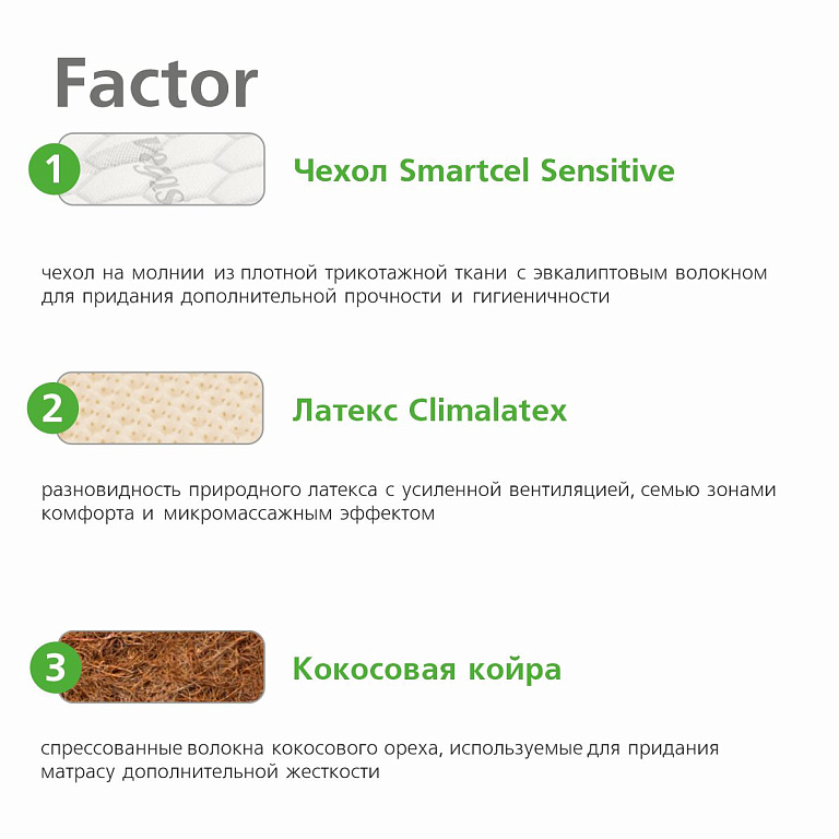 Climalatex | Разновидность латекса с усиленной перфорацией и повышенной вентиляцией. Имеет рельефную форму с семью зонами комфорта и микромассажным воздействием. Надежно подстраивается под контуры тела, обеспечивая расслабление. |