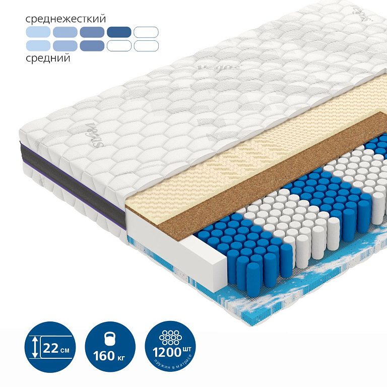Medizone R2200 | Блок независимых пружин из закаленной стали с выраженными зонами. Сбалансированное распределение зон по длине матраса наиболее эффективно учитывает анатомию тела человека. Уникальная центральная зона обеспечивает поддержку людей разного роста. Диаметр пружины 40 мм. Высота пружинного блока 140 мм. |