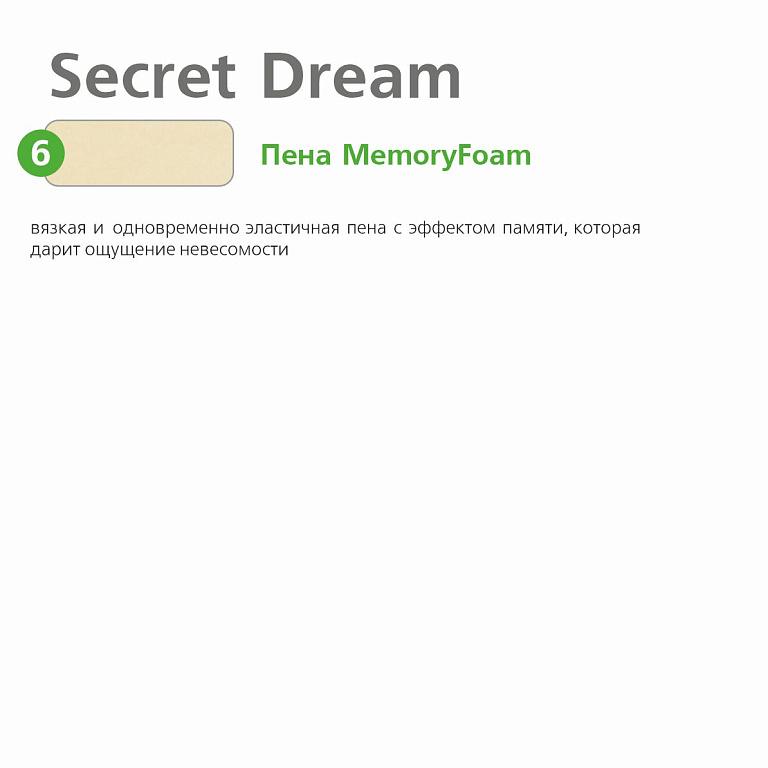 MemoryFoam Инновационный материал с памятью формы, используемый в космической промышленности. Обладает одновременно вязкостью и эластичностью, даря спящему ощущение невесомости.